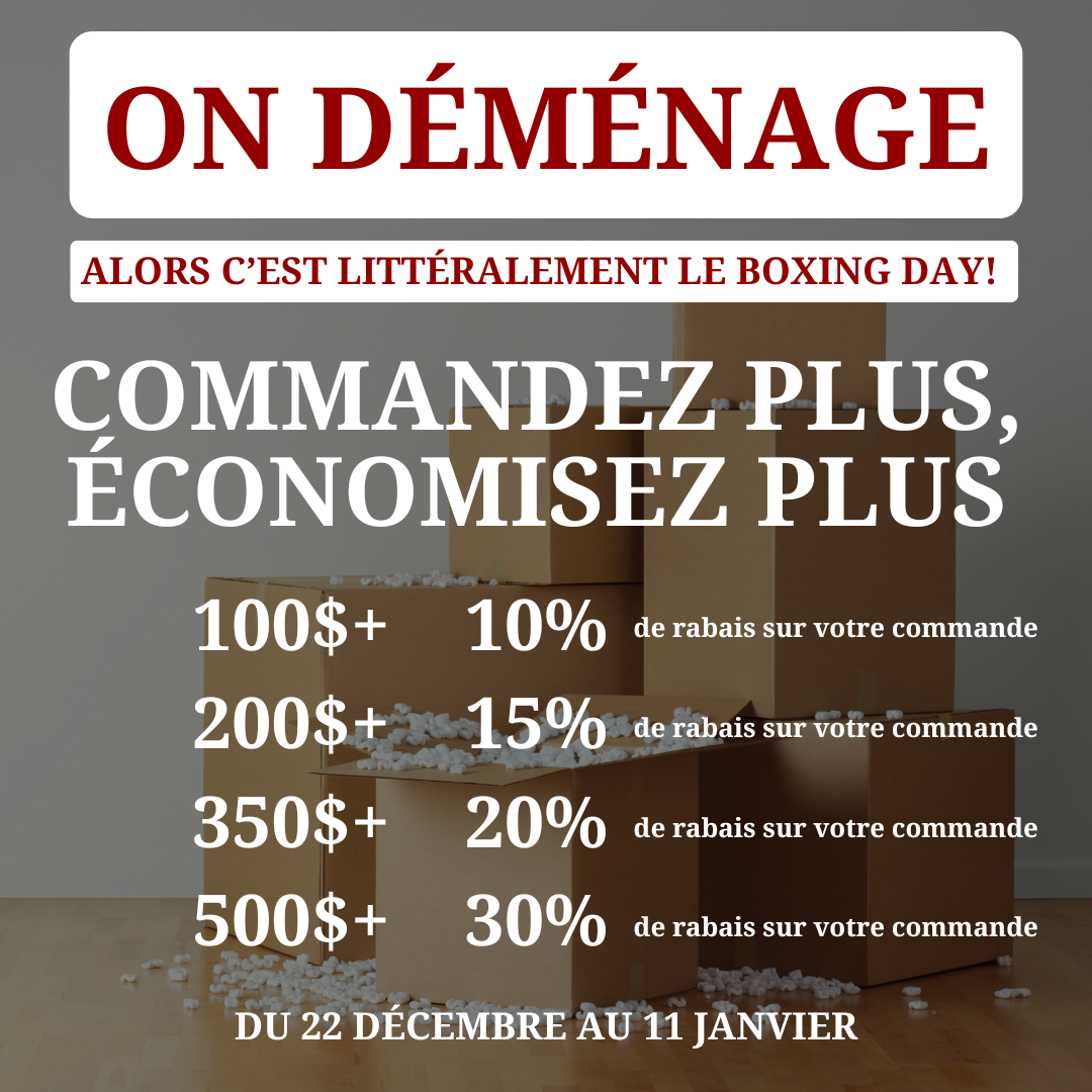 Plus tu commandes durant le Boxing Day, plus gros est le rabais sur ta commande! Alors assure-toi de remplir ton panier avant qu'il n'en reste plus!