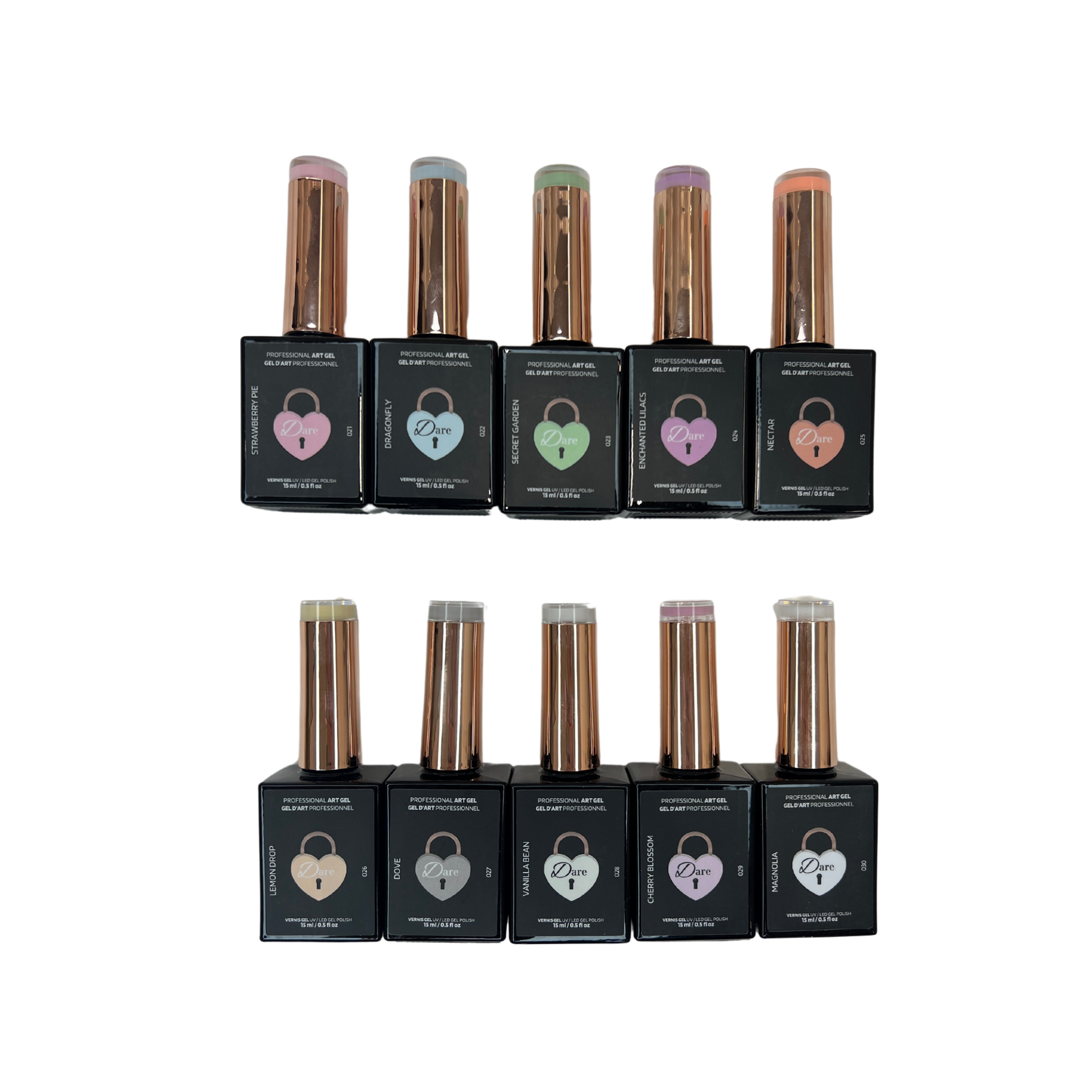 Collection "Blossom With Dare" : Immergez-vous dans la beauté du printemps avec la collection "Blossom With Dare". Cette collection comprend dix nuances exquises inspirées des teintes délicates des fleurs en éclosion et de la sérénité de la nature. Du rose doux et du vert pastel aux oranges chauds et aux bleus clairs, chaque gel d'art de cette collection est soigneusement sélectionné pour évoquer la fraîcheur et la vitalité de la saison.