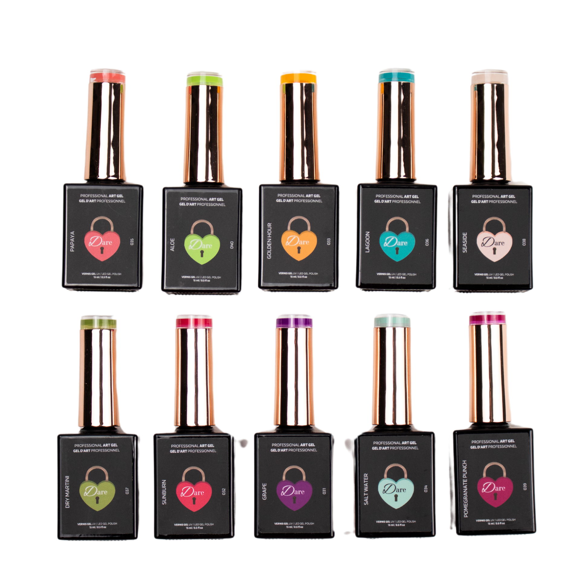 Vivez l'électrisant turquoise de "Lagoon (036)" et l'élégance raffinée de "Dry Martini (037)". Laissez "Seaside (038)" apporter la beauté intemporelle des rivages à vos ongles, suivi du magenta vibrant de "Pomegranate Punch (039)" et du vert frais et fluorescent de "Aloe (040)".